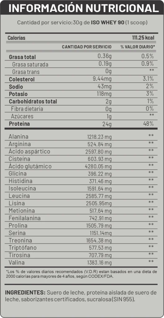 ISO WHEY 90 es la opción ideal para quienes buscan una fuente de proteína de alta calidad, ligera y fácil de digerir. Gracias a su rápida absorción, es perfecta para cualquier momento del día; por ejemplo, por la mañana como complemento en comidas bajas en proteínas, entre comidas como un snack saludable, y después del entrenamiento para potenciar la recuperación muscular. Además, es una excelente opción para quienes siguen dietas bajas en carbohidratos y grasas.